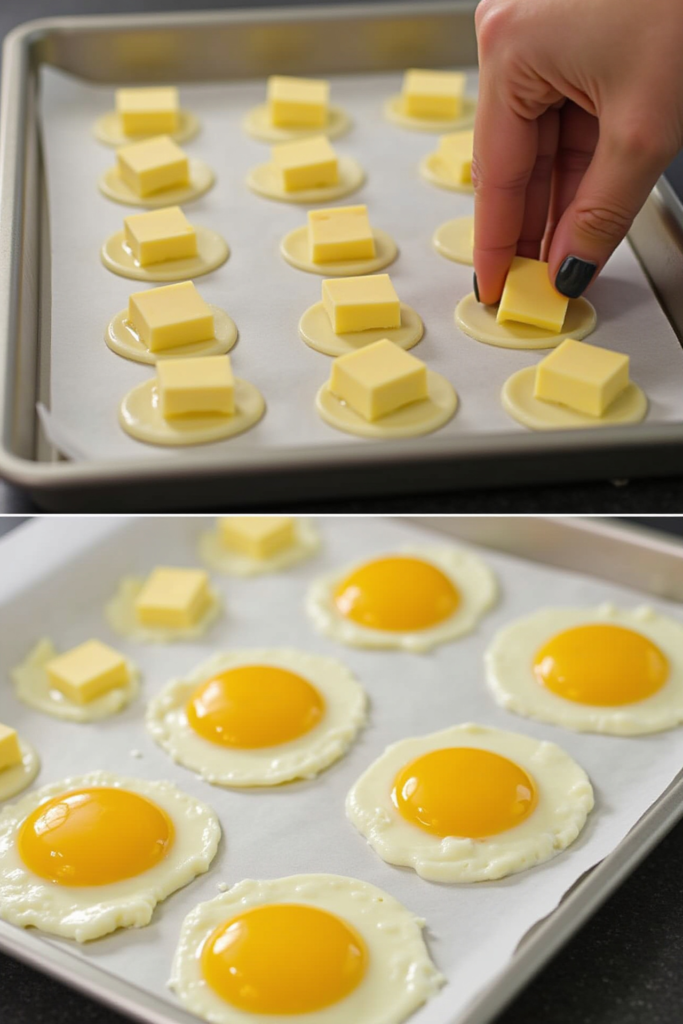 4. Sprinkle cheese and optional fillings (ham, veggies) onto one side of the eggs.